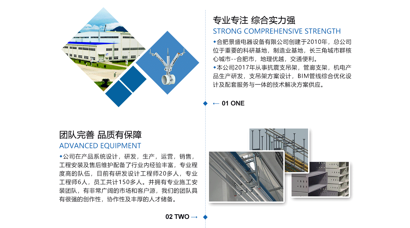 合肥景盛電器設備有限公司創建于2011年,注冊資本3000萬,總公司位于中國重要的科研基地,制造業基地,長三角城市群中心城市-----合肥市,地理位置好,交通方便。本公司2017年從事抗震支吊架,電纜橋架,機電產品生產研發,支吊架方案設計,BIM管線綜合優化設計及配套服務與一體的技術解決方案供應。公司在產品系統設計,研發,生產,運營,銷售,工程安裝及售后維護配備了行業內經驗豐富,服務程度高的隊伍,目前有研發設計工程師20多人,工程師6人,員工共計150多人。并擁有施工安裝團隊,有非常廣闊的市場和客戶源,我們的團隊具有很強的創作性,協作性及豐厚的人才儲備。 公司先后通過ISO9001:2015質量管理體系認證...
